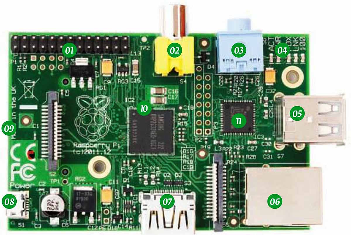 01 - Интерфейс GPI0 02 - Видеовыход RCA 03 - 3.5-мм аудиовыход 04 - Светодиодные индикаторы 05 - пара USB2.0 06 - 10/100 Мбит/с Ethenet 07 - Видеовыход HDMI 08 - Micro-USB для питания 09 - Разъем SDHC (сзади) 10 - SoC Broadcom ВСМ2835 11 - Чип USB-хаба и Ethernet