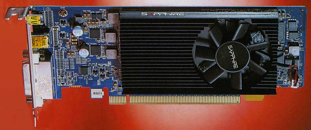 Кстати, о кулере SAPPHIRE HD7750. Видеокарта низкопрофильная. Поэтому за охлаждение чипа и памяти отвечает крохотный кулерок. Адаптер занимает один слот расширения. Из активных элементов отметим небольшой 40-миллиметровый вентилятор. Отметим и его назойливую, шумную работу во время серьезной загрузки.