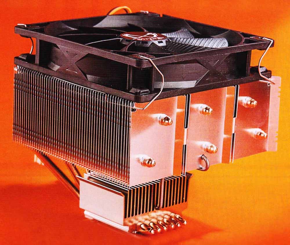 Kabuto II состоит из шести тепловых трубок и блока из 53 алюминиевых пластин. Сверху на пластины при помощи металлических скрепок крепится 120-мм вентилятор. Возможности установить вторую крыльчатку нет. К подошве припаян еще один радиатор с 20 ребрами. Основание - не зеркальное, отражение достаточно мутное. При этом мы заметили, что подошва Kabuto II не ровная, а имеет форму конуса (??? – вы чего там курите – ???), что в итоге может сказаться на эффективности охлаждения.