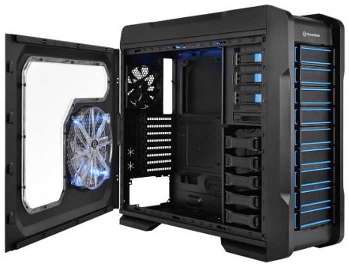 Thermaltake позиционирует корпуса Chaser в первую очередь для сборки мощных систем. Об этом говорит обилие вентиляторов: три на вдув и два на вытяжку. Впускные вентиляторы закрыты фильтрующей сеткой, которую стоит чистить раз в несколько месяцев. Хочешь бесшумную систему? Chaser готовы к установке жидкостного охлаждения, в корпусе присутствуют отверстия для шлангов. Монтаж 3.5-дюймовых и 5.25-дюймовых устройств осуществляется без отвертки, те же «харды» удобно ложатся в салазки, которые задвигаются внутрь.