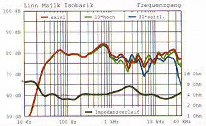 Der Bassbereich der Isobarik reicht trotz der kompakten Abmessungen bis etwa 38 Hertz bezogen auf -3 Dezibel. Mittlere Frequenzen um 700 Hertz werden in einer breiten Winkelzone lauter abgestrahlt als tiefere und höhere Bereiche. Die Impedanzkurve (schwarz) verläuft mit geringen Schwankungen sehr verstärkerfreundlich. Der Wattbedarf ist vergleichsweise hoch.