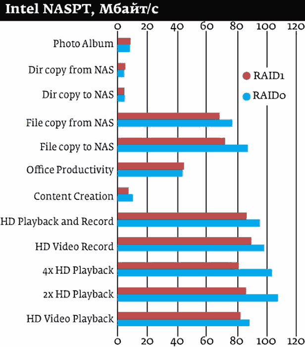 Мы воспользовались проверенной методикой, которая задействует утилиту Intel NAS Perfomance Toolkit. Программа достаточно подробно эмулирует работу в различных режимах, включая офисные или мультимедийные. В итоге мы получаем значения скорости для каждого из них. Так как наш накопитель может работать в различных условиях, мы проводили два теста: в массивах RAID 0 и RAID 1. В каждом из режимов тест проводился три раза, а данные были усреднены от всех трех попыток. Первый режим работы обещает большую скорость работы, второй же гарантирует полное дублирование информации. По результатам тестов были получены две таблицы и все сведено в один график.