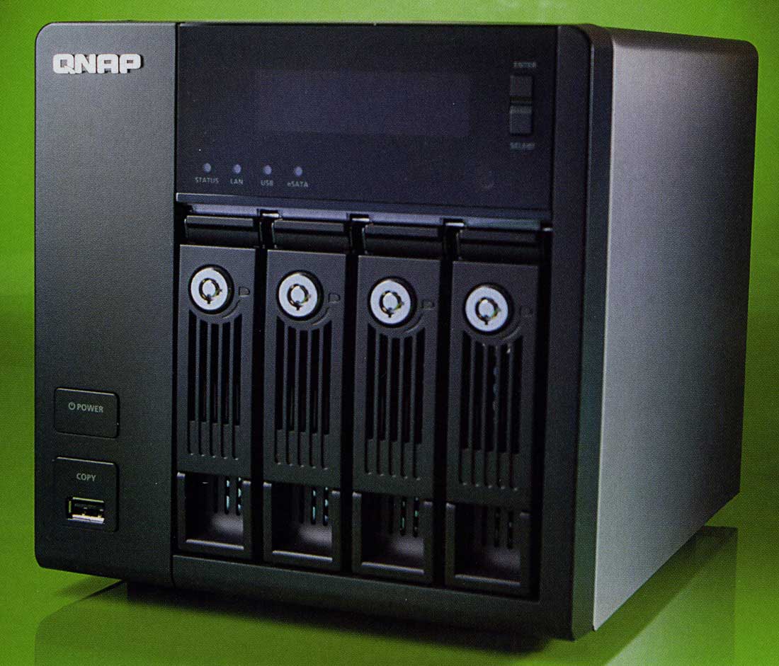 Внешний вид любого сетевого накопителя QNAP можно считать классическим. Скажем больше: ты наверняка заметил, что некоторые производители пытаются скопировать его. На передней панели помимо четырех отсеков для установки жестких дисков (под ключ) есть матричный дисплей, кнопка Power и USB 2.0 порт с функцией резервного копирования. Рядом с LED есть «качелька» управления экраном. Из дополнительных информационных элементов можно отметить индикаторы активности жестких дисков, а также «мигалки» Status, LAN, USB, eSATA. В общем, повторимся, перед нами самая настоящая классика.