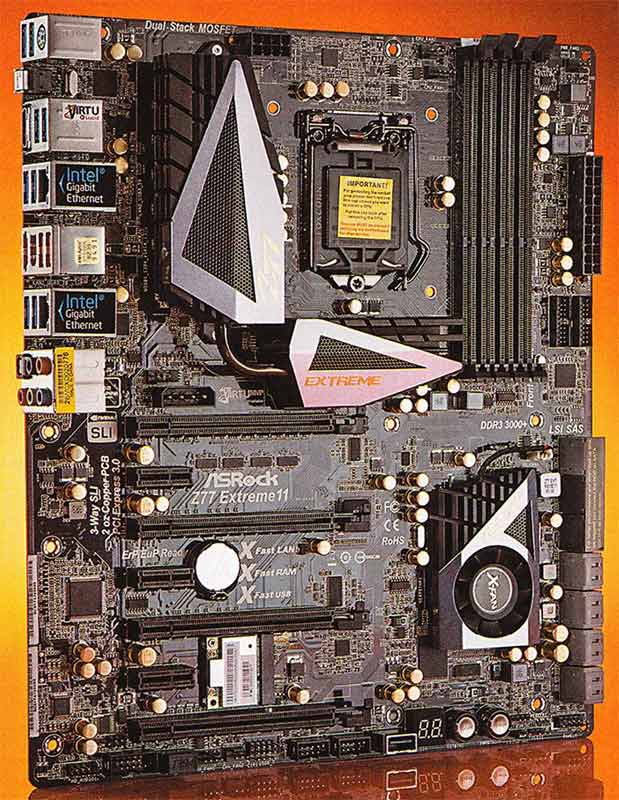 Первая плата сегодня, и сразу может показаться, что топовее «материнки» уже быть не может. Extreme11 среди текстолитовых девайсов ASRock всегда славились своей навороченностью. Не стала исключением «мама» на базе набора логики Z77 Express.