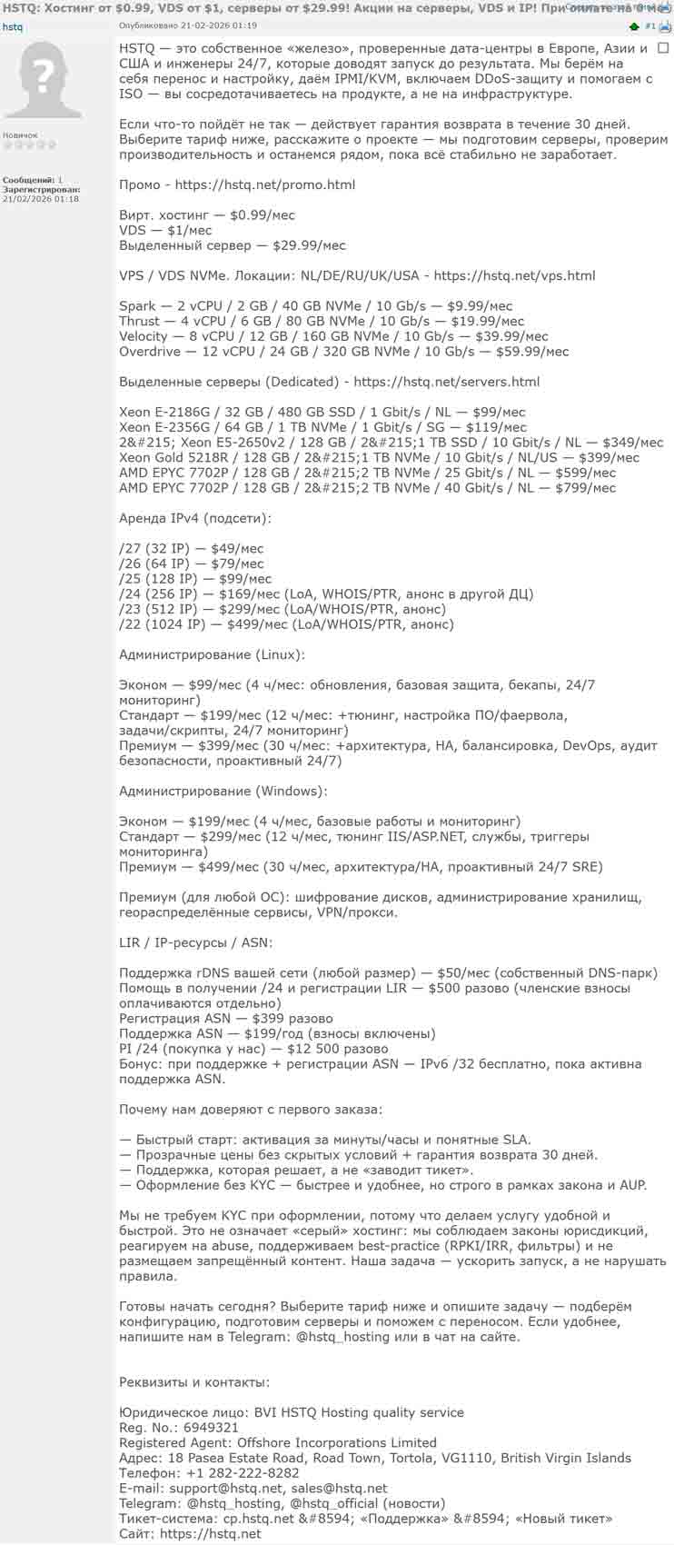 Итак, типичное: зарегистрировался пользователь hstq и сразу разместил такое сообщение.