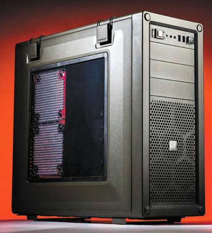 Не только каркас, но и лицевая панель выполнена из стали - вопреки сложившейся среди большинства производителей традиции «лепить» менее прочные пластиковые панели. В ней есть фильтр от пыли, а за ней - место для двух 120-мм вентиляторов, которые в комплект не входят. На верхней панели расположены две ручки, самое оно для геймеров, странствующих по свету со своим верным другом - игровым компьютером.