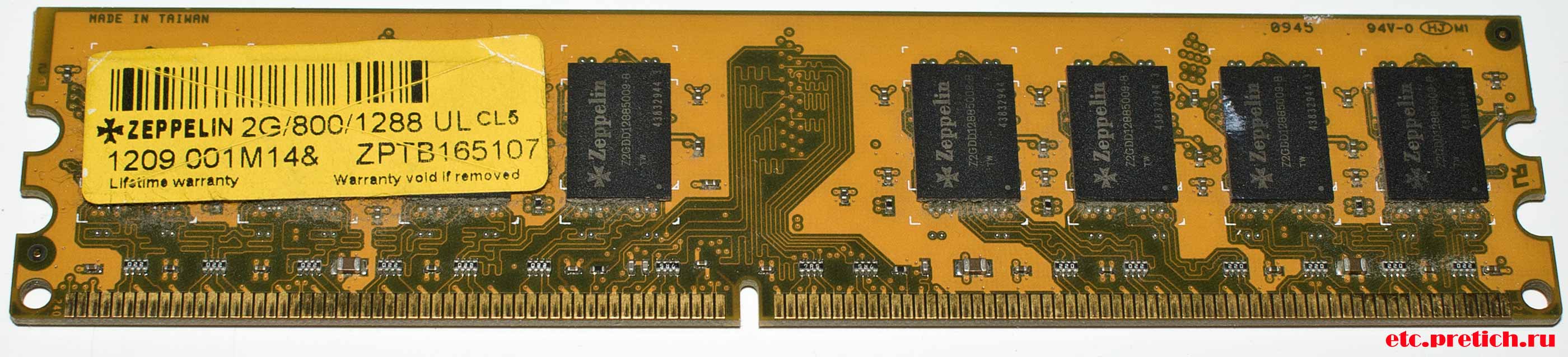 Сам модуль стандартного оформления - желтый или золотистый цвет, черные чипы... Этикетка на ней логотип Цеппелин, затем такое: 2G/800/1288 UL CL5 1209 001M14& ZPTB165107, а на текстолите - Сделано в Тайване. Данные на этикетке расшифровываются так: модуль памяти объемом 2 гигабайта, эффективной частотой 800 МГц, восемь чипов по 128 Мб каждый (а здесь какая-то неувязка). И основное значение таймингов - латентность 5 наносекунд (это быстро).