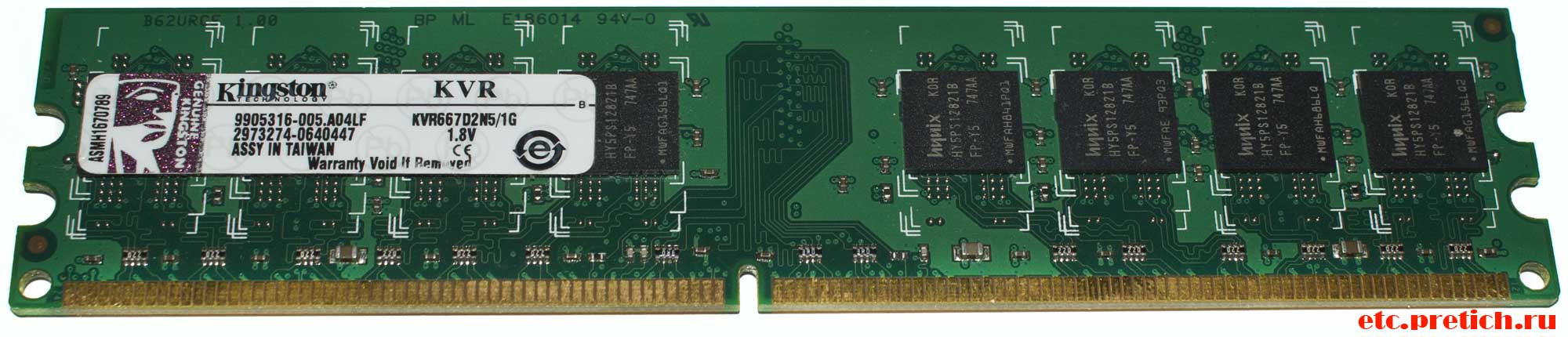 So, these are standard sizes of modules... Textolite covered with green varnish... Label with the famous logo - Kingston Technology. The lineup is KVR, or, as they say, this is the name of the line. And the model name is KVR667D2N5 / 1G, where everything is deciphered as follows: line - KVR, clock frequency 667 MHz, type - DDR2, timings - 5 latency, module capacity - 1 GB. The specified supply voltage is 1.8 volts.